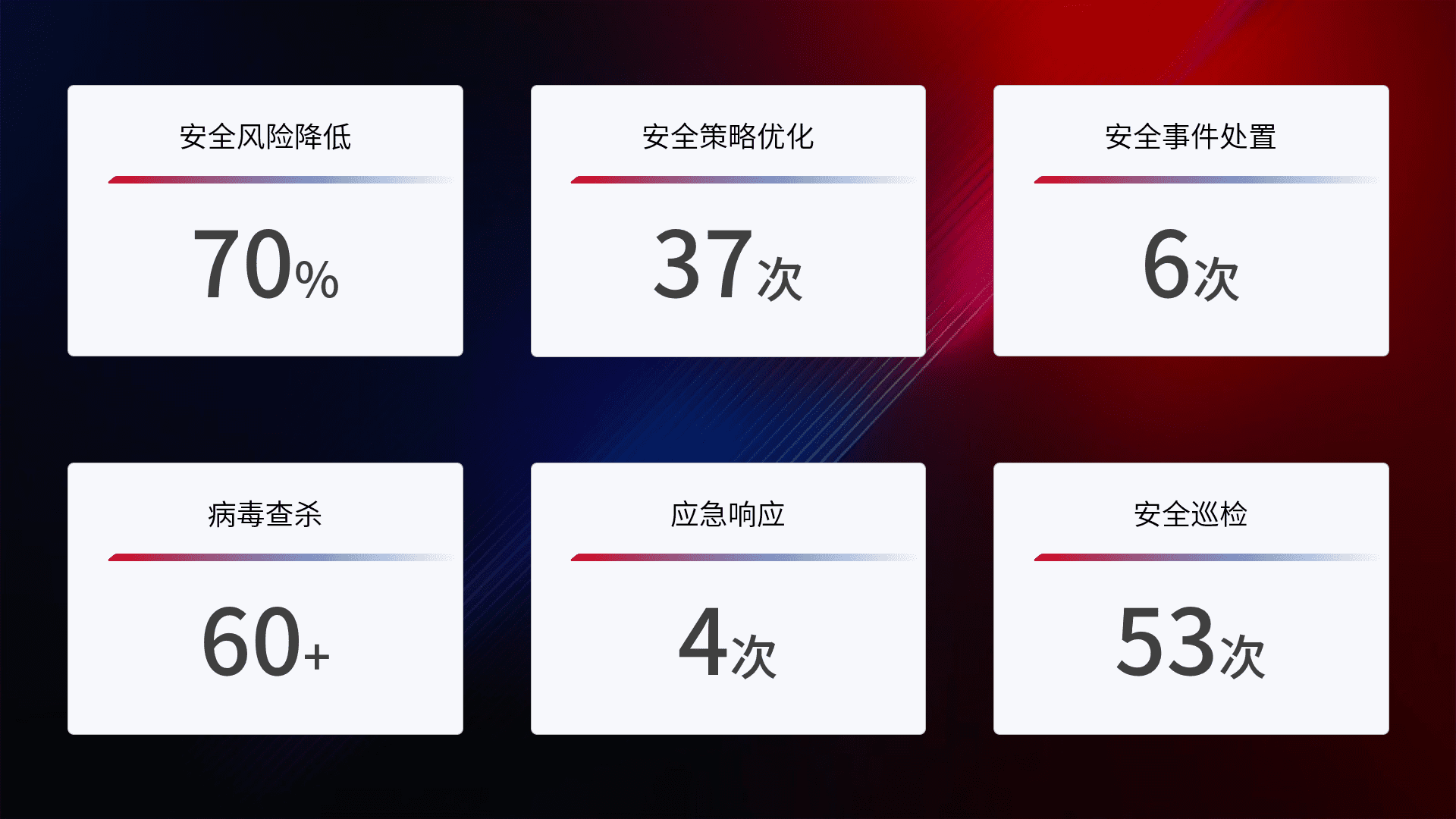 提供全面的安全事件报告体系,,,包括处置报告、、周报、、季度和年度总结,,,,结合持续监控,,帮助客户深入了解网络安全状况。。。。