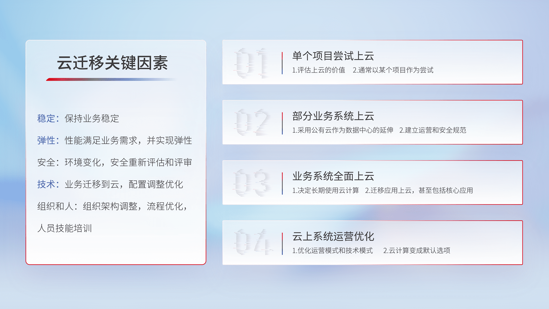 结合实际业务,,从规划设计、、、、云平台选型、、、云原生改造、、、、数据迁移、、、、集成交付,,,迁移全过程为客户识别最佳上云路径,,做好风险识别管理,,,设计网络架构、、身份权限、、、、安全审计合规、、操作审计、、、日志审计、、监控告警策略、、、多站点容灾设计等,,对云上基础设施进行整体规划,,,,提升IT治理水平,,,以满足弹性、、高可用、、、高性能的需求。。。。