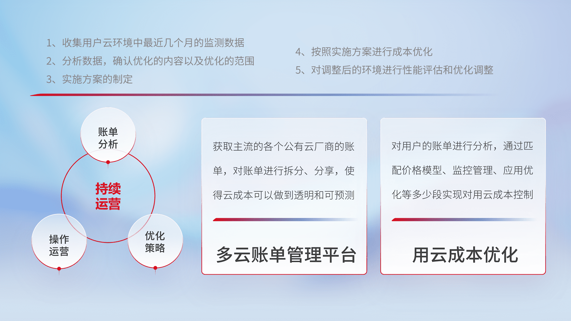 通过多云纳管,,,以统一的资源数据模型把客户的云资源进行抽象和封装,,,,进而实现对多云资源的统一操作,,保障云资源管理的可靠性、、稳定性与可用性。。。量身定制化运维内容,,,,配置、、、、开发运维、、、、补丁管理、、、备份、、、监控、、、认证和访问管理、、审计和日常巡检等,,保障在用云过程中的可靠度,,,,稳定度以及高可用率。。。