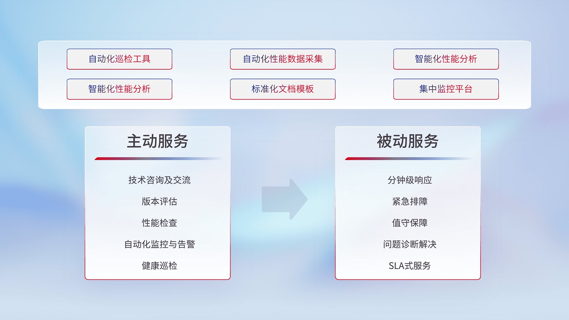 智能化工具和标准化文档,,,,保障服务质量,,提供主动服务(包含技术咨询、、版本评估、、、性能检查、、自动化监控与告警、、、、健康巡检)和被动服务包含(分钟级响应、、、、紧急排障、、、、值守保障、、、问题诊断解决、、、、SLA服务)。。。。